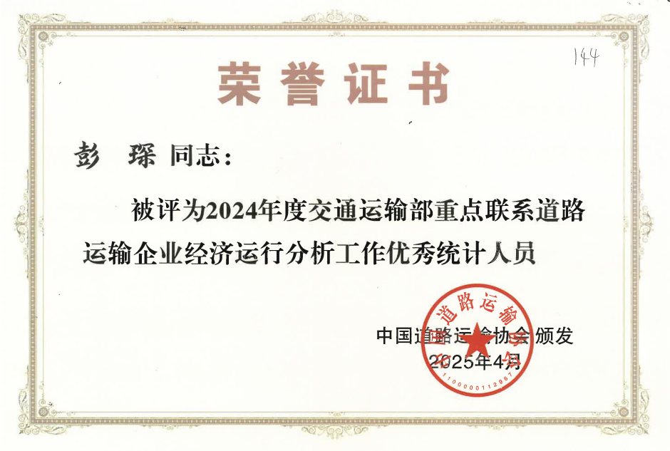此次會議和表彰工作由中國道路運輸協(xié)會組織。同時榮獲“優(yōu)秀統(tǒng)計人員”的還有益陽湘運集團股份有限公司客戶服務(wù)部彭琛。會議共表彰來自全國各地的先進單位102家、優(yōu)秀個人117名。 (彭琛 鄧玉姬)