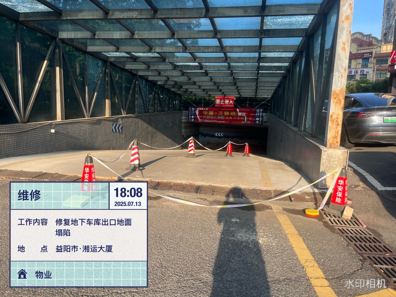 7月13日18:08,湘運(yùn)大廈前坪地下車庫(kù)出口處,幾名工作人員正頂著烈日、冒著酷暑在施工。原來(lái)這是湖南遠(yuǎn)程建設(shè)集團(tuán)有限公司物業(yè)部正在對(duì)其地面塌陷情況進(jìn)行修復(fù),確保路面能正常通行。